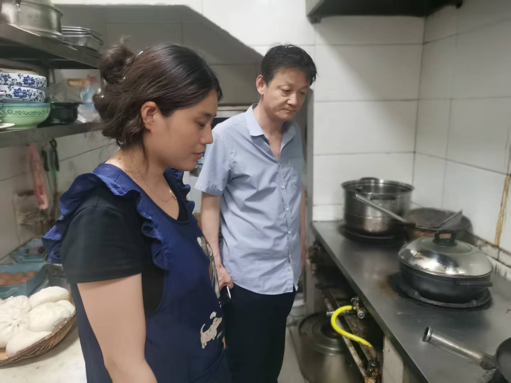 6月17日上午,高密市委组织部组织二科科长孙增刚到西关社区德邻馒头共富工坊现场调度二楼研学场景打造工作。