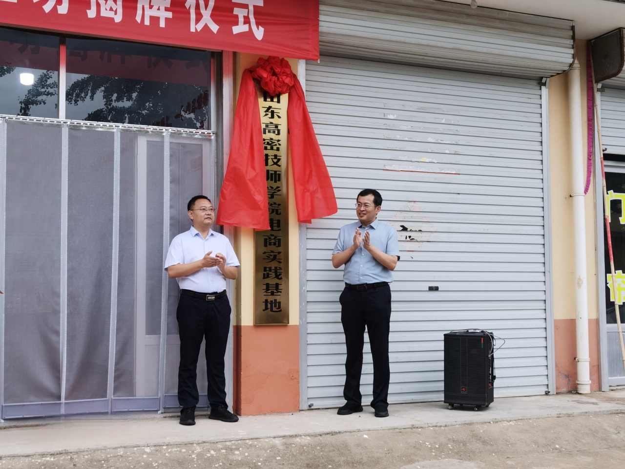 ★市委组织部副部长,市人社局党组书记、局长张伟与山东高密技师学院党委委员、副院长杜兆君为山东高密技师学院电商实践基地揭牌。